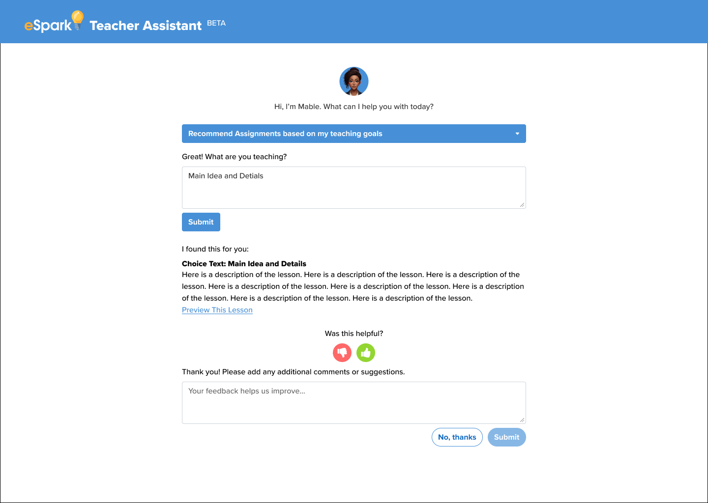 We built Nova, a teacher assistant that suggests eSpark Assignments, advice, and teaching strategies that align with a teachers’ Core Curriculum lesson.